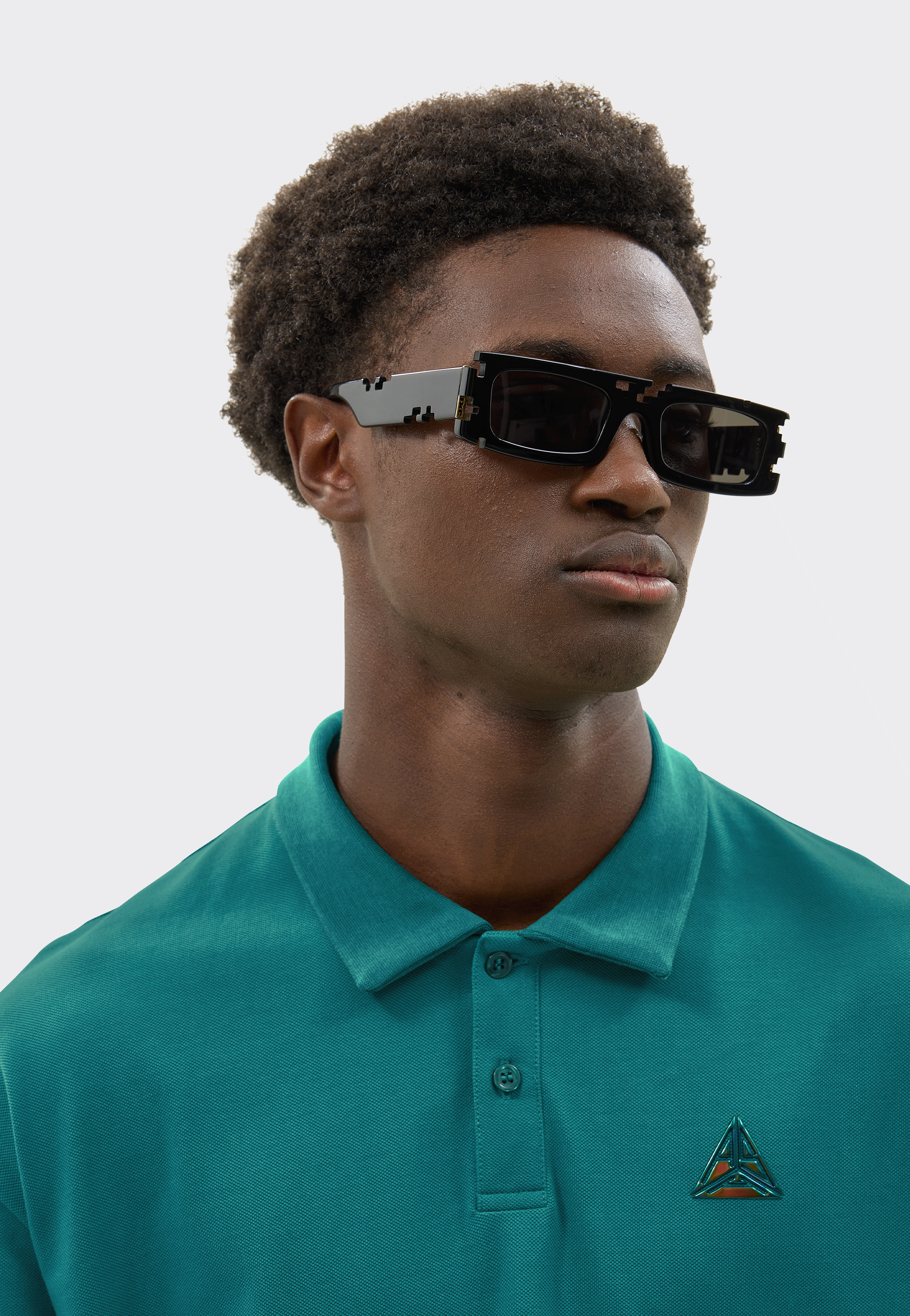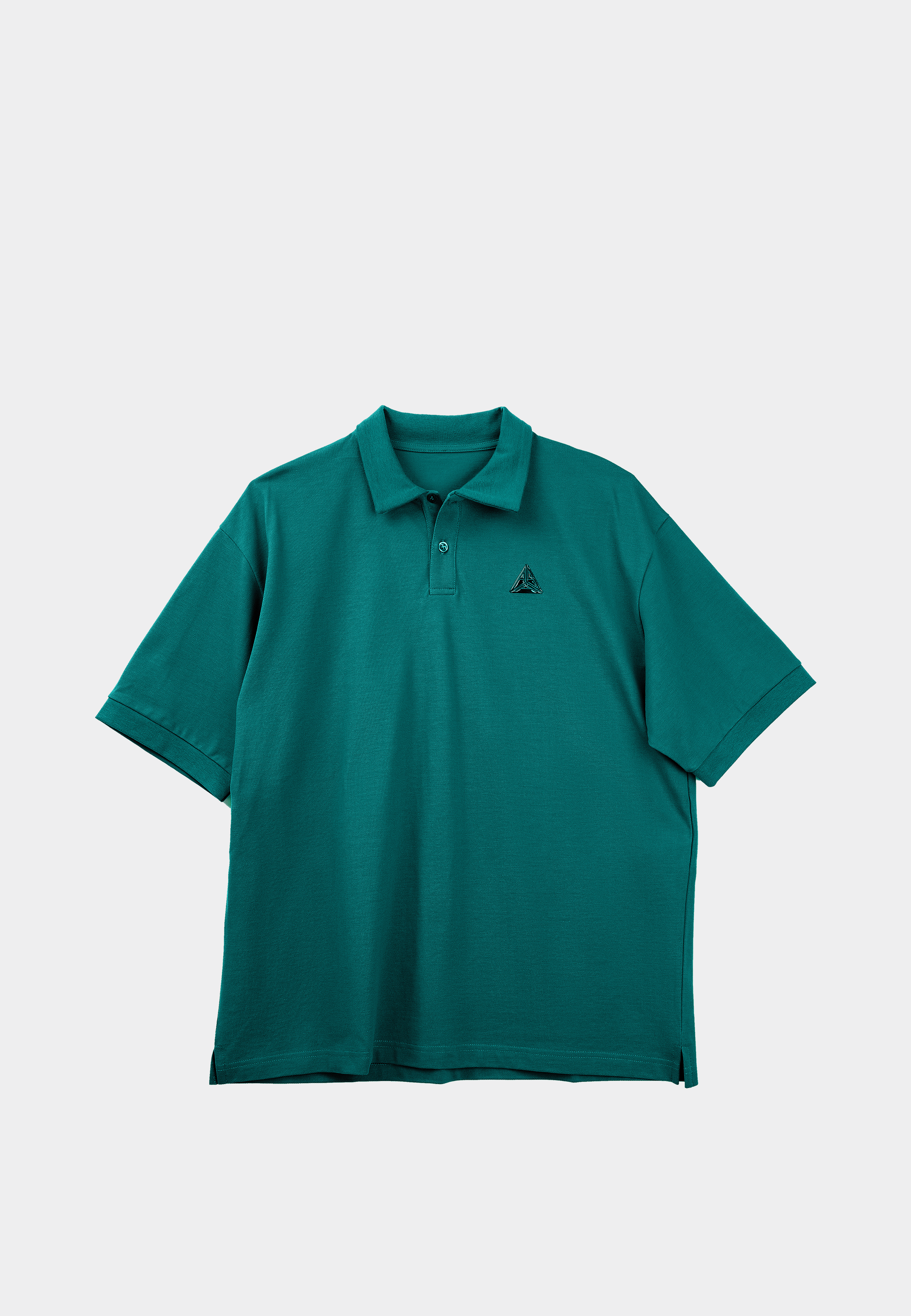 This short sleeve polo shirt fuses tailored flair with futuristic energy. Crafted from breathable mid-weight cotton piqué, it features a 3D glossy metallic triangle logo and wordmark, giving the classic silhouette a hyper-modern edge. Finished in a striking pine green, this piece stands out with quiet confidence.
