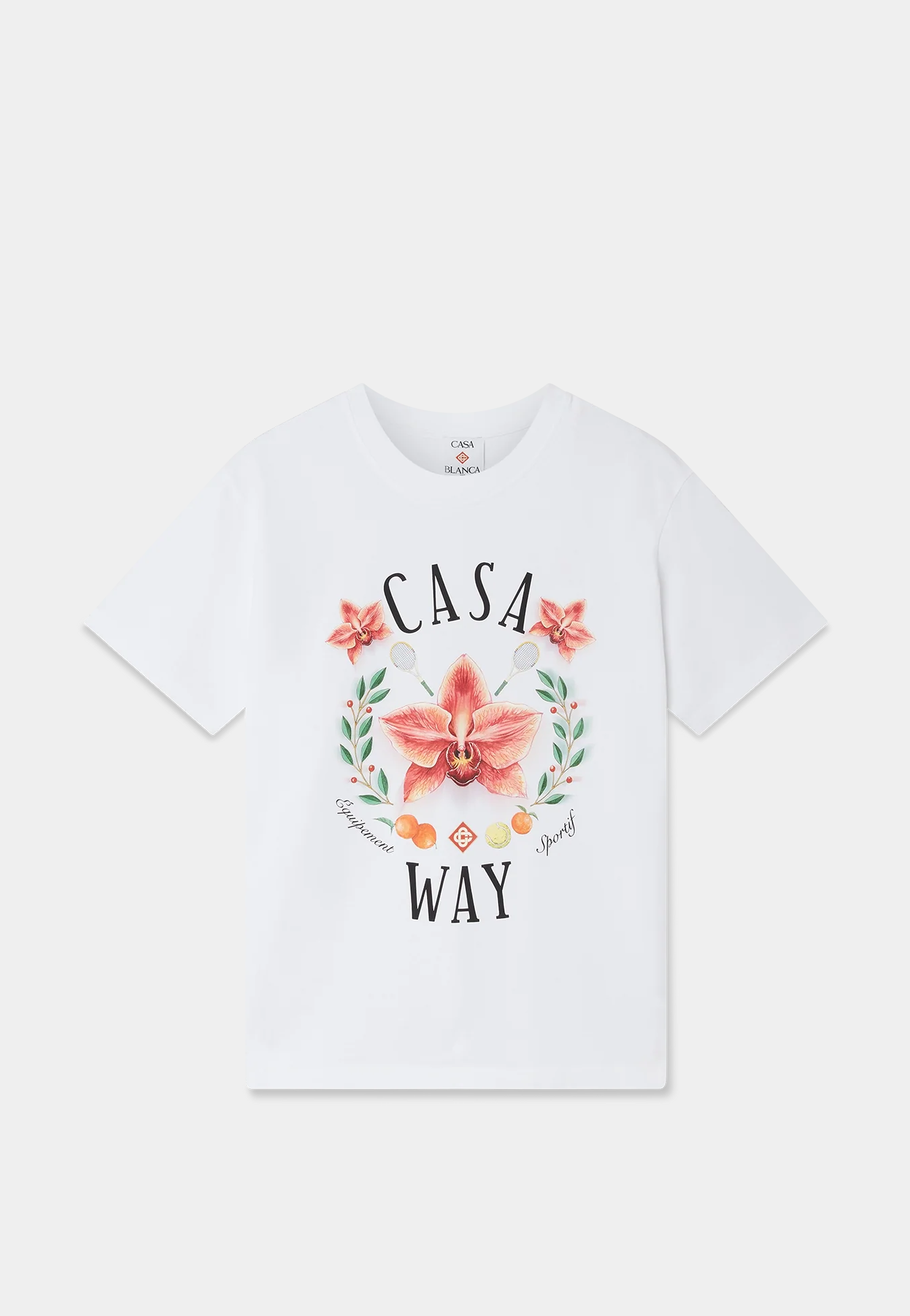 The T-shirt that makes a botanical motif feel like the sharpest thing in the room. Casablanca, founded in Paris in 2018, renders the Casa Way Orchid graphic across the chest of 100% organic cotton with a crew neck and a relaxed silhouette that carries the botanical detail with complete ease. Available now at Ashluxury, a destination for luxury fashion online shopping carrying the full Casablanca clothing range. Wear with silk shorts for a full Casablanca set or with tailored white trousers.