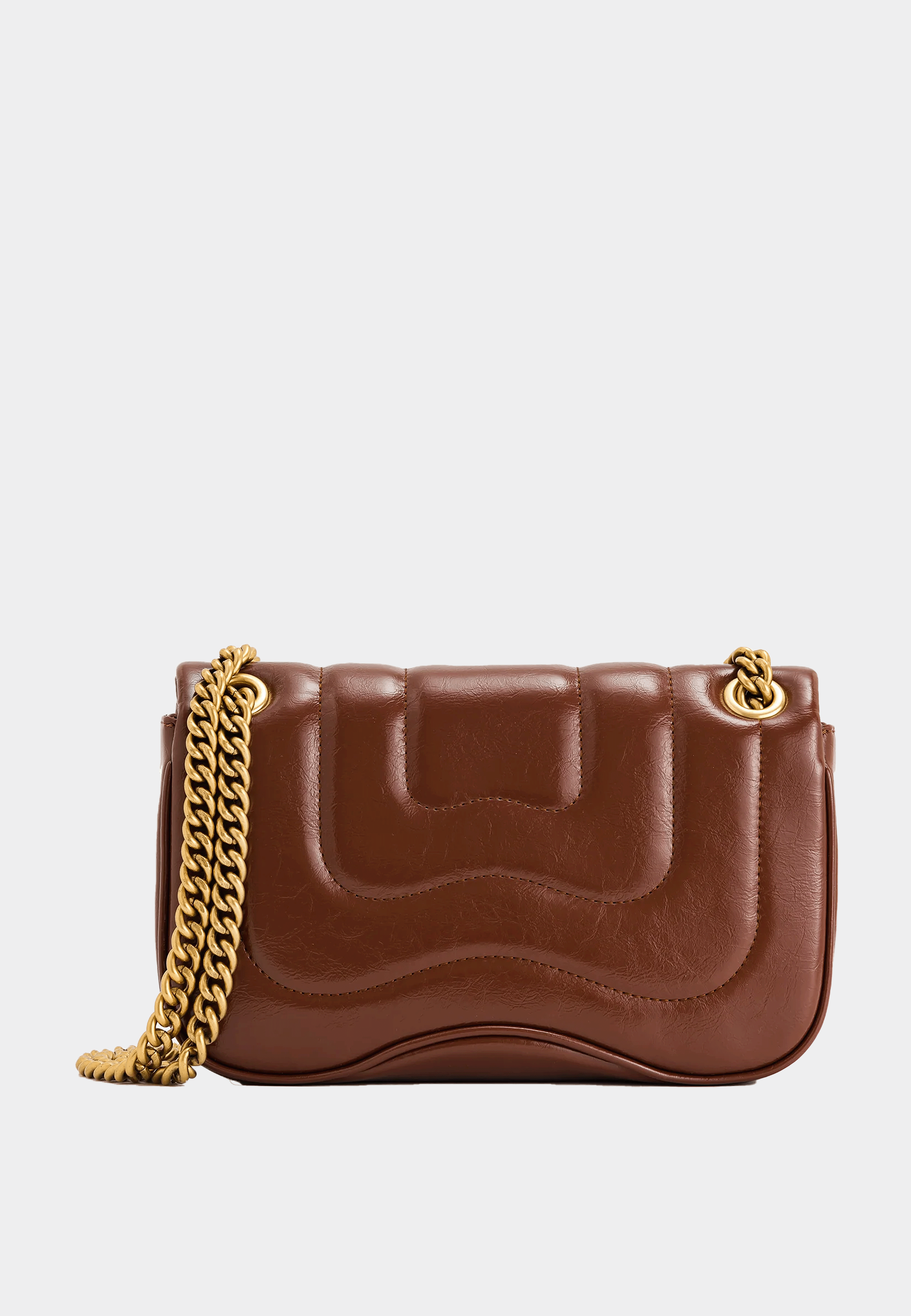 The Wavy Flap Chain Crossbody Bag features a sculptural wavy silhouette. It is crafted from oiled wax vegan leather. The bag includes a gold chain strap for shoulder or crossbody wear. Interior pockets include one slip pocket and one zipper pocket.