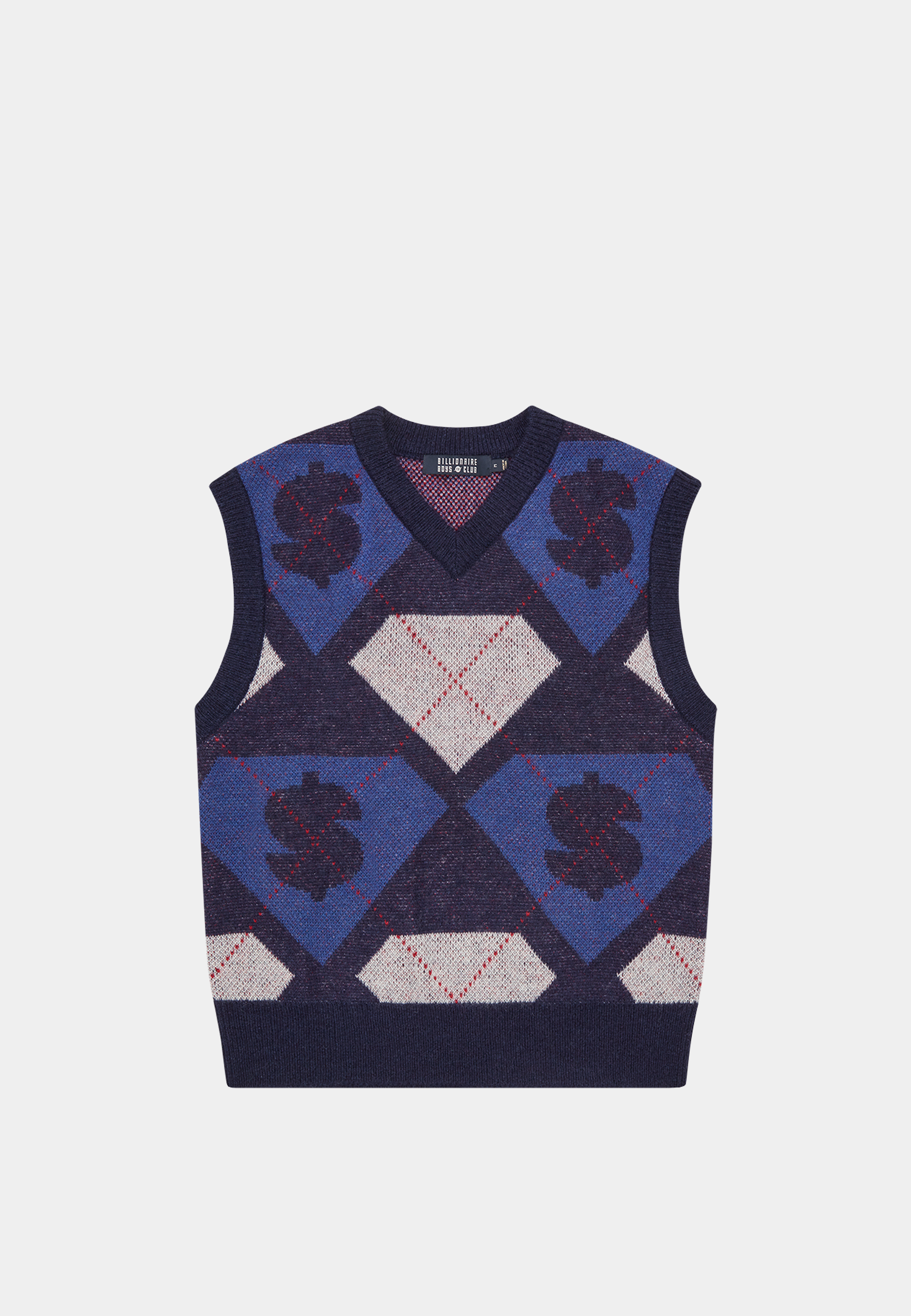 The knitted vest that makes a case for investment dressing. Billionaire Boys Club, founded in 2003, brings material consideration to every seasonal knitwear release. The Diamonds & Dollars Argyle Knitted Vest Blue is constructed in a 47% acrylic, 30% nylon, 15% wool, 8% mohair blend with an all-over Diamonds & Dollars argyle jacquard motif, a V-neckline, and a sleeveless cut that makes it the most versatile layering piece in the collection. Available now at Ashluxury, a curated designer clothing boutique carrying the full Billionaire Boys Club range. Layer over a long-sleeve crew or a collared shirt and wear with tailored trousers.