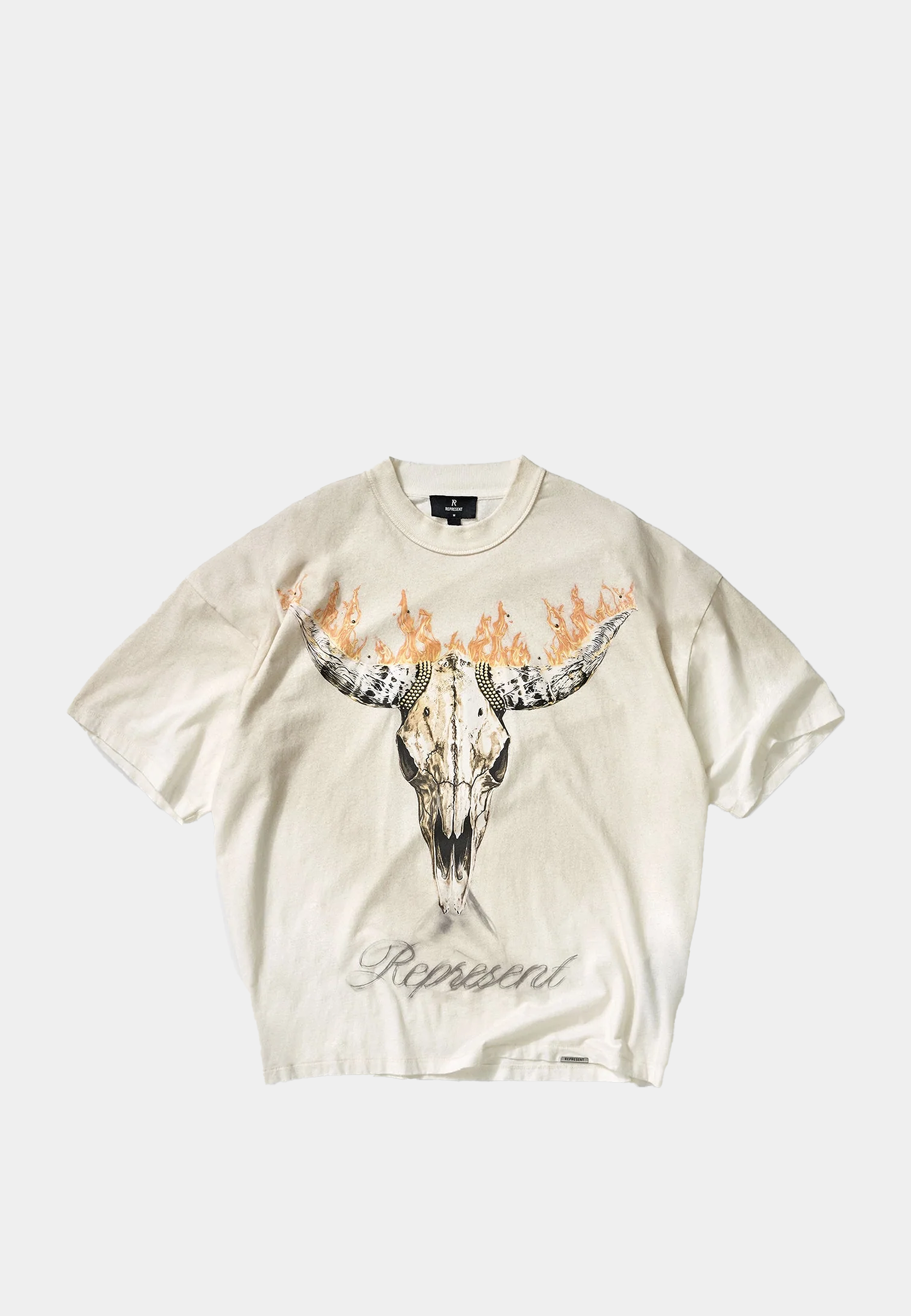 A graphic that wears its references proudly. The Represent British Cowboys T-Shirt Washed Ecru is built from an 85% cotton, 15% hemp blend in a boxy oversized silhouette - the kind of t shirt that feels broken-in from the first wear. Represent, founded in Manchester in 2012, built its name on premium construction wrapped in graphic identity that carries genuine cultural weight. Metal claw stud embellishments and a bull skull graphic sit at the front; tonal script print at the back rewards closer attention. Available now at Ashluxury as part of the current Represent edit - a destination for luxury fashion online shopping that brings the best of British streetwear to one curated store. Wear with wide-leg denim and clean sneakers, or over tailored shorts for sharper contrast.