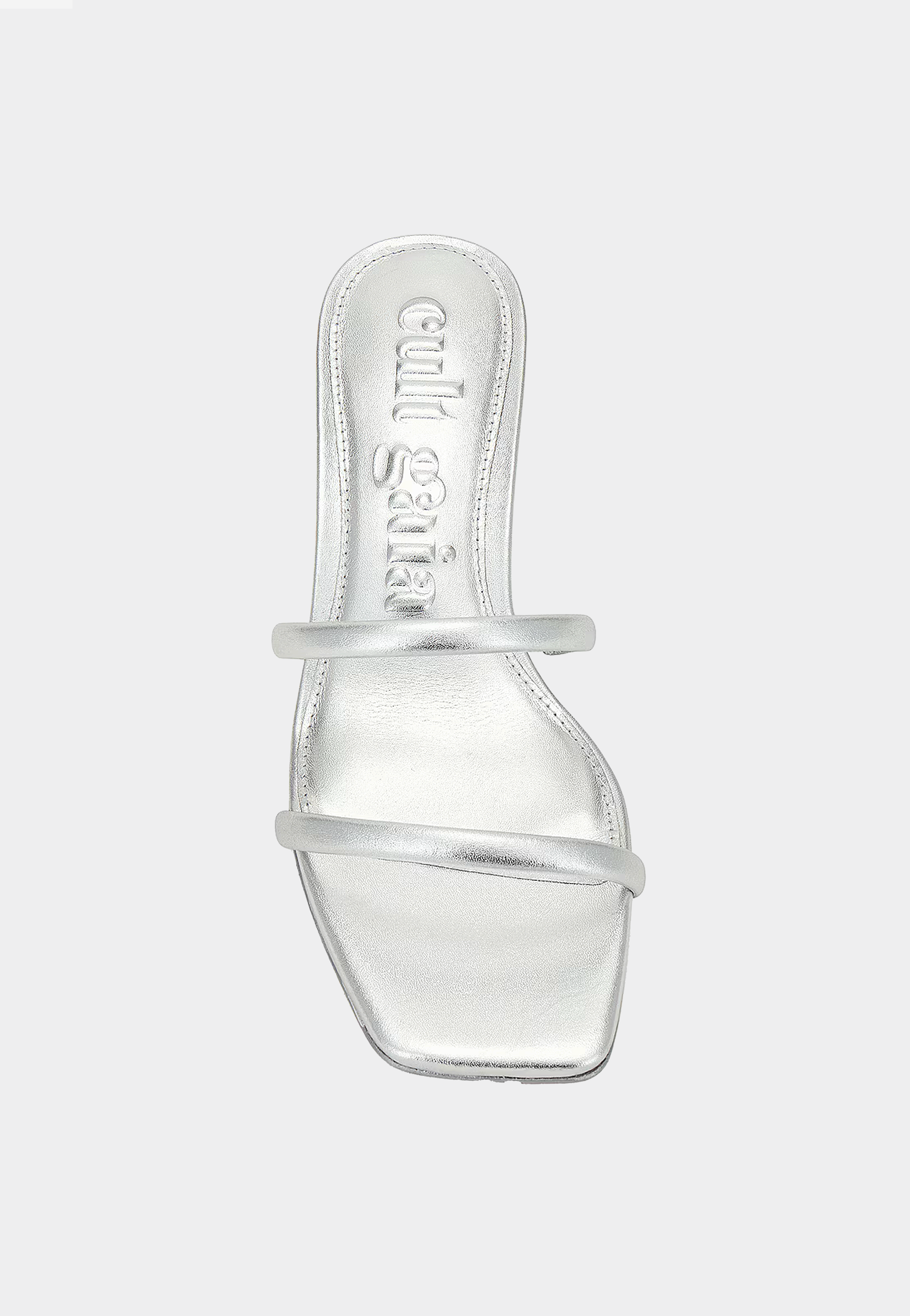 Straps: The sandal features minimalist silver-toned leather straps that elegantly frame the foot, providing both style and support.