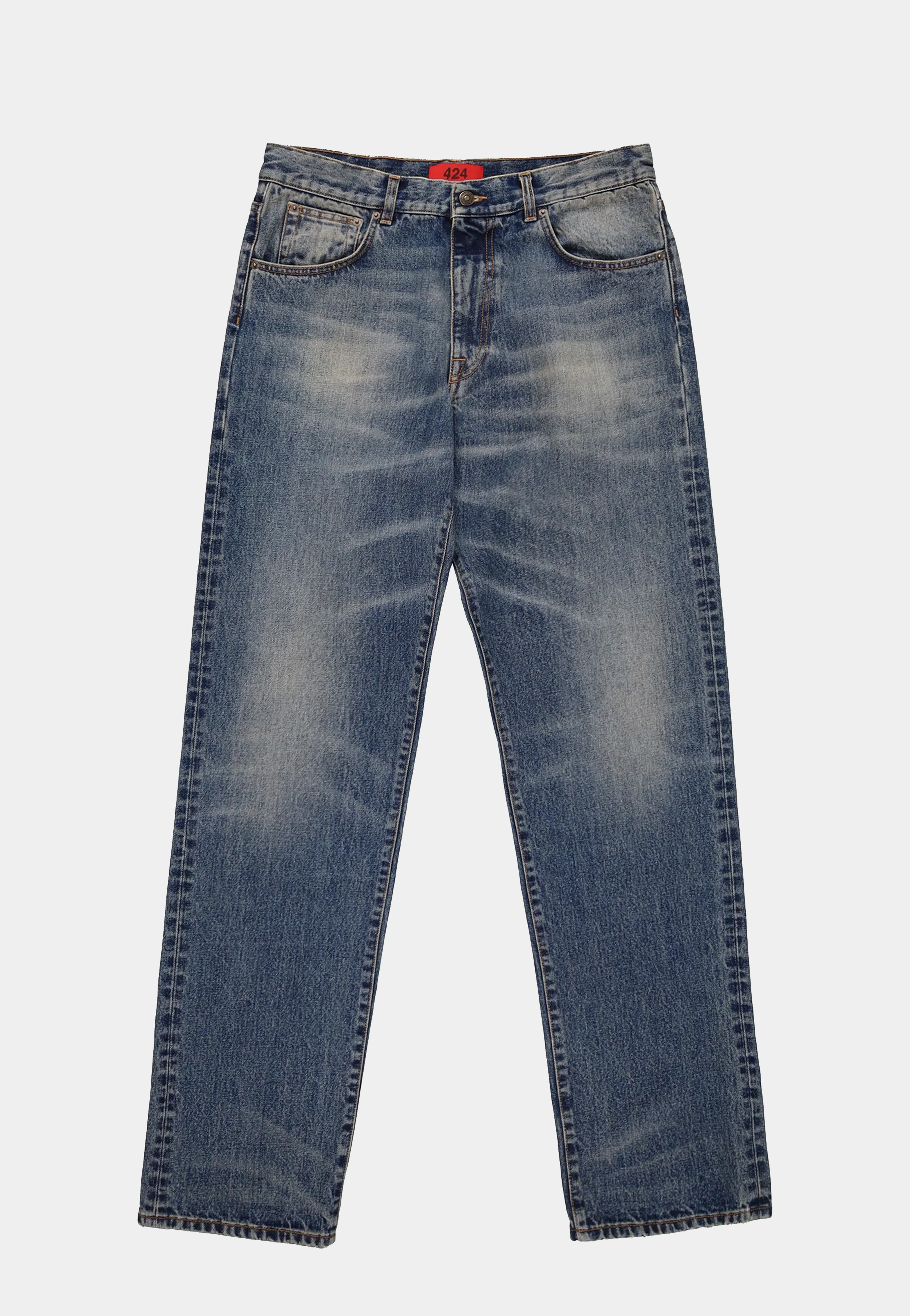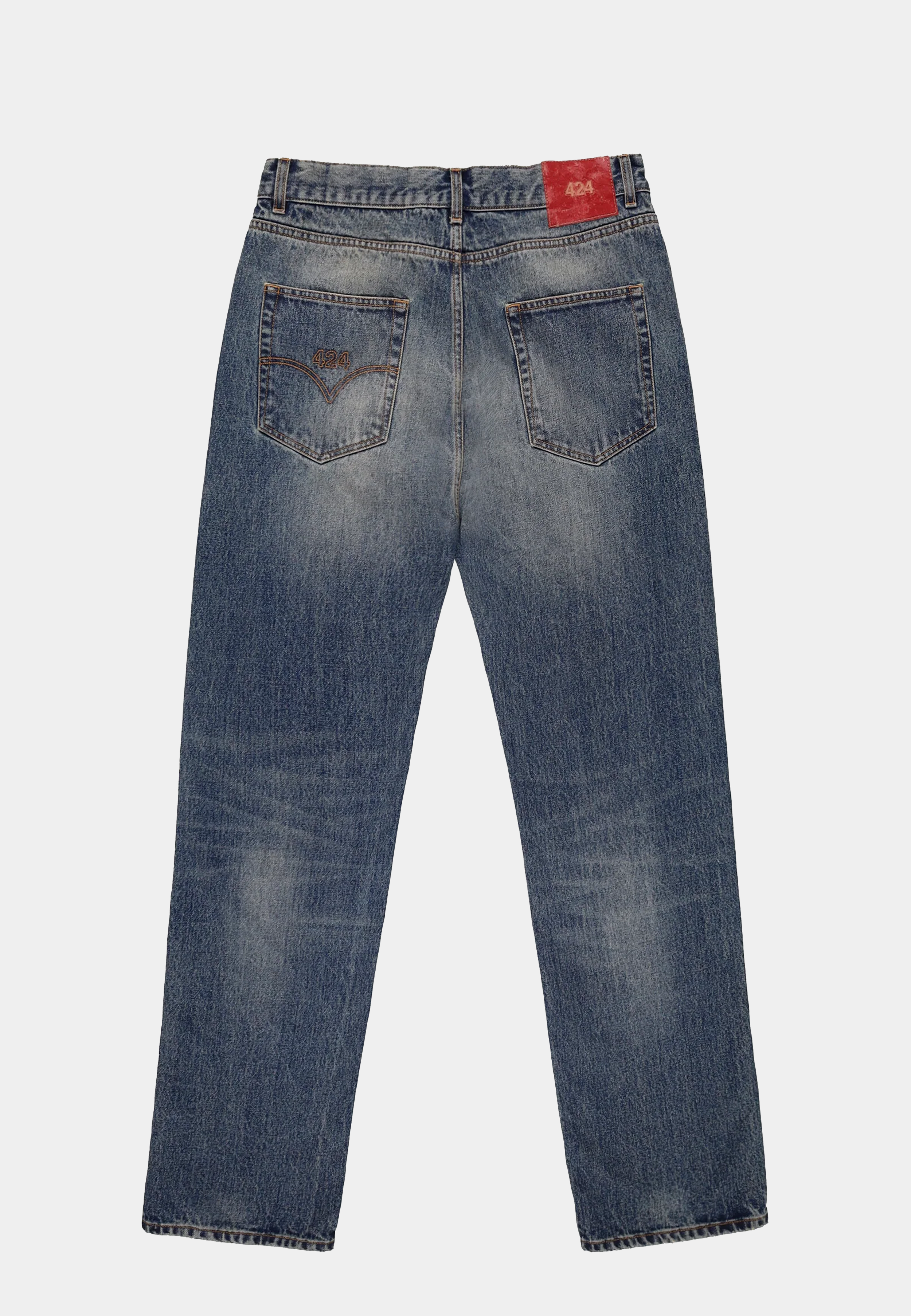 Featuring a five-pocket styling and a whiskering effect, the 424 loose five pocket denim delivers a relaxed charm. A 424 logo patch at the back waistband and an embroidered logo on the back pocket add iconic branding touches, while the contrast stitching in tan enhances their classic appeal. The front button and zip fastening with belt loops provide functionality, and logo-engraved antiqued gold-tone hardware gives a refined finish. Whether dressed up or down, these jeans are your go-to for versatile style.