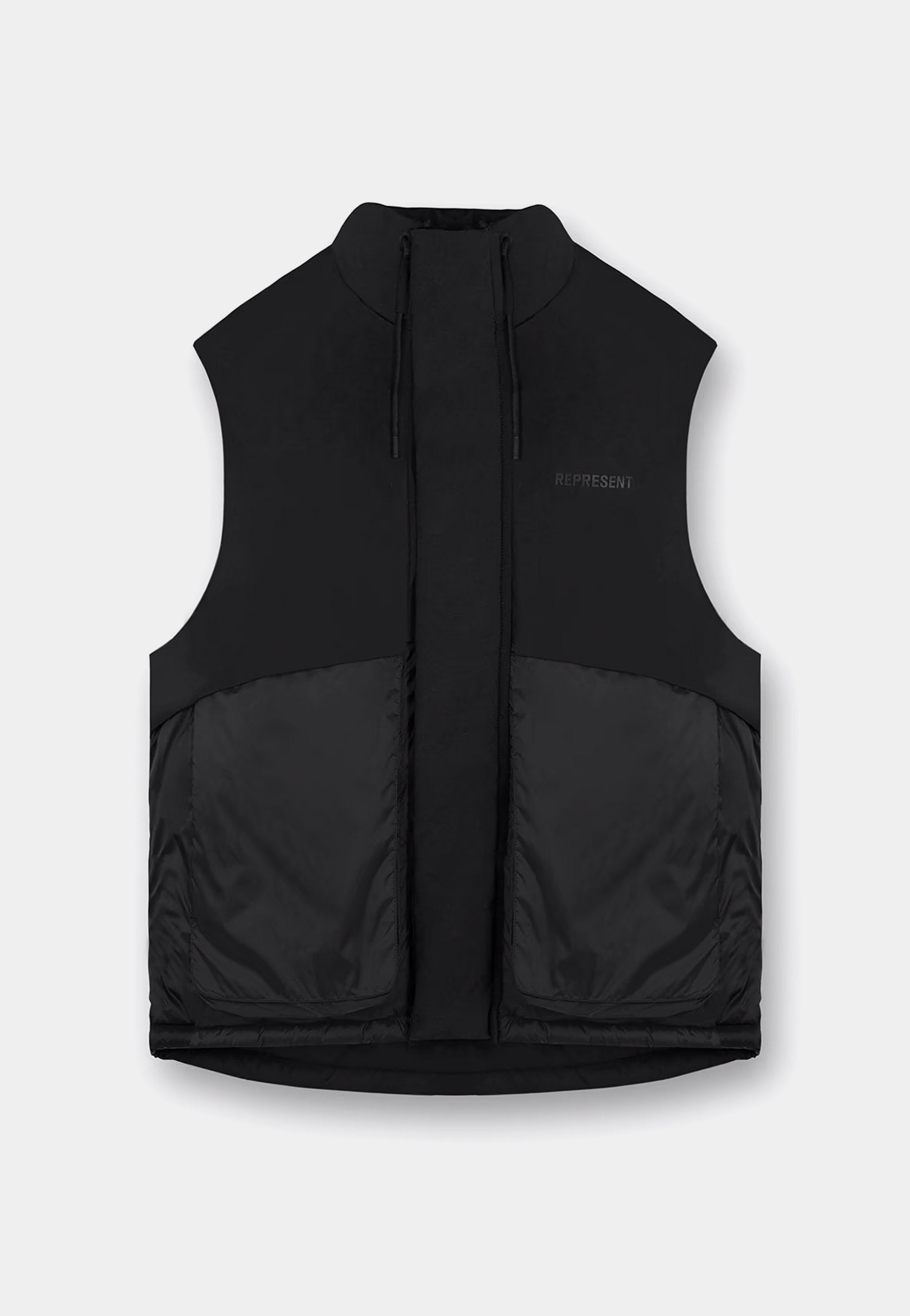 The Represent Layered Puffer Gilet combines functional warmth with sleek design. Featuring a padded, quilted construction with down-feather filling, it offers superior insulation. The sleeveless silhouette includes a high drawstring neck, front zip and press-stud fastening, and practical pockets, both inside and out. Finished with the Represent logo at the front, this versatile piece is perfect for colder days.